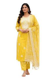 Women Embroidered Kurta Pant Dupatta Set, Magic Cotton Fabric, Bright Yellow, Floral Work, Size XXL - 2XL