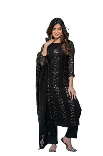 Georgette Sequins Embroidered Readymade Kurta Set with Heavy Crepe Pants and Dupatta, Black, Wedding Suit for Women - S